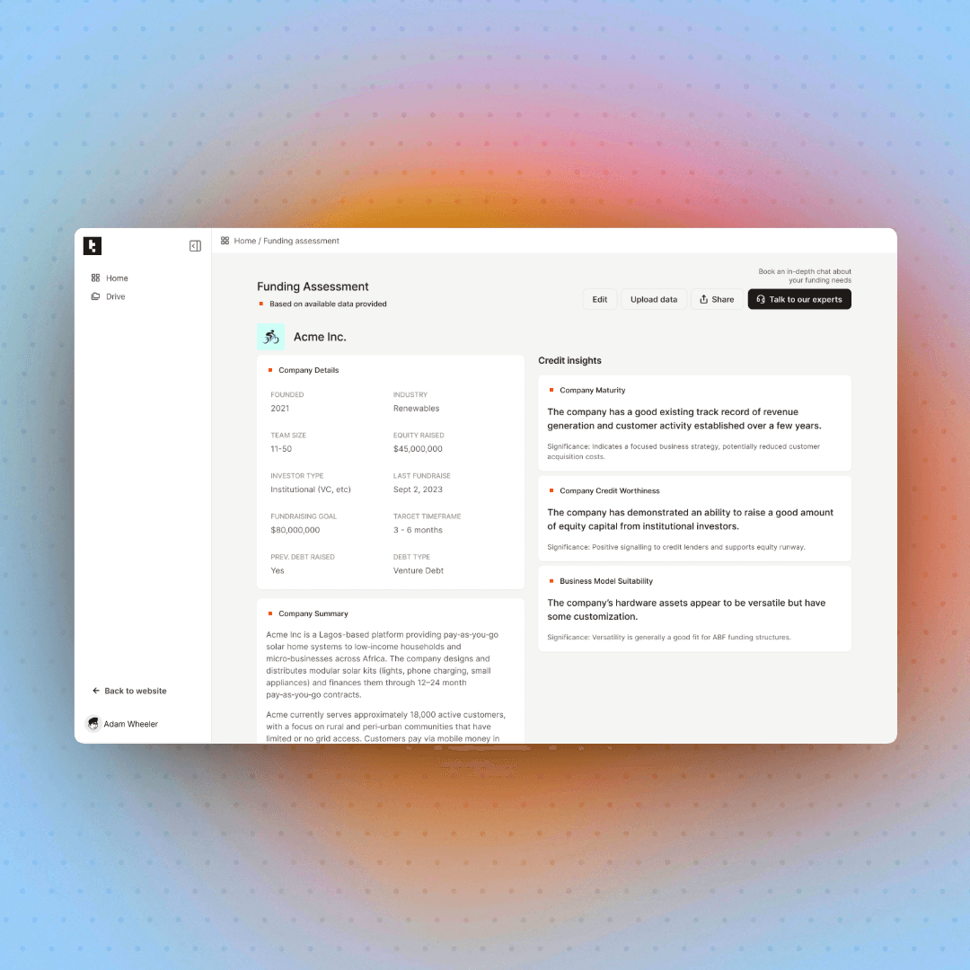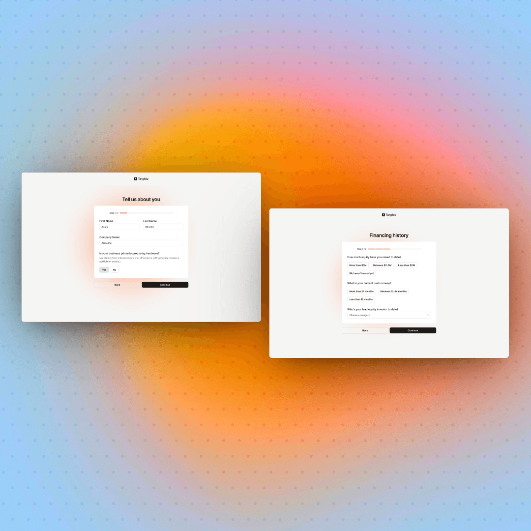 Tangible's mission is to change that. Their Prepare product guides hardware founders through everything they need to get "lender-ready", by organising their data, structuring their policies and generating the materials that lenders actually want to see.